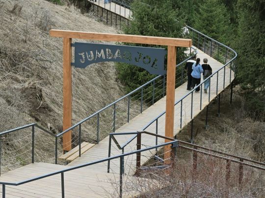 Пешеходная тропа, проложенная между высоченных елей. Извилистый деревянный подиум, перила и крыша из хвои деревьев - центр притяжения для любителей эффектных селфи и фотографий.
